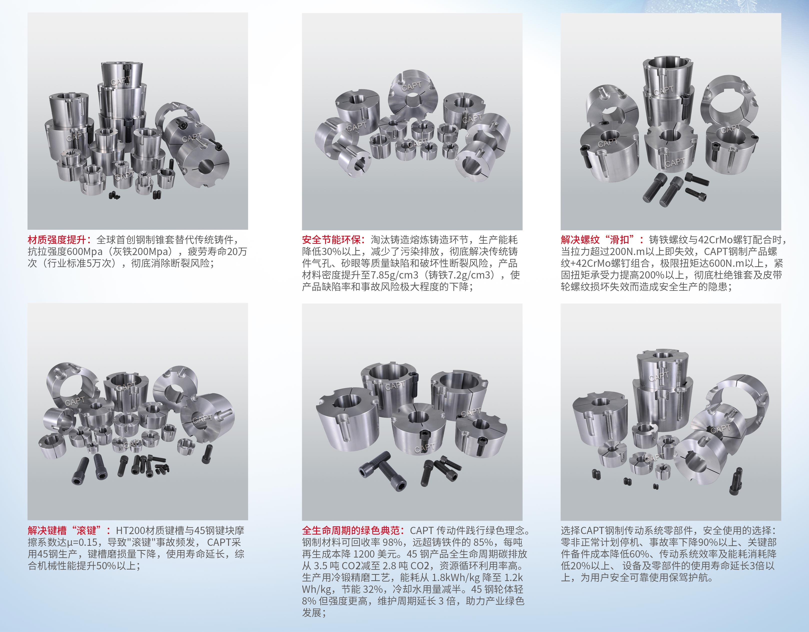 石家莊凱普特公司作為中國首家鋼制錐套研發生產企業及國家錐套標準起草單位(成立于1986年),CAPT近40年專注高端傳動件制造,以高強度、高精度、少無隱患、綠色環保、可持續發展為核心,率先完成錐套、皮帶輪、鏈輪產品的安全升級: